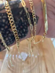 This set features multiple gold-tone chain styles—from bold links to sleek, minimal designs—carefully crafted to be worn together or individually.
